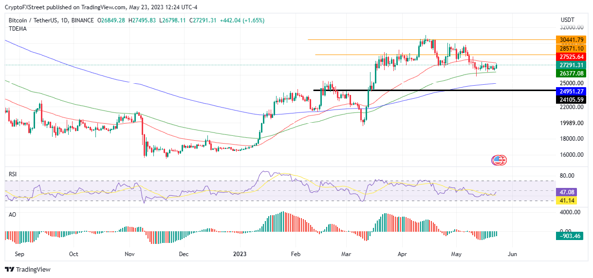 Bitcoin (BTC) price is committed to pushing higher after bulls regained control in the Tuesday trading session. At press time, Bitcoin price of $27,291 is confronting selling pressure from the 50-day Exponential Moving Average (EMA) at $27,525. A decisive flip of this hurdle into support could pave the way for more gains, and as investors cast their nets further, the odds would be better once the king crypto crosses above the $27,680 psychological level.