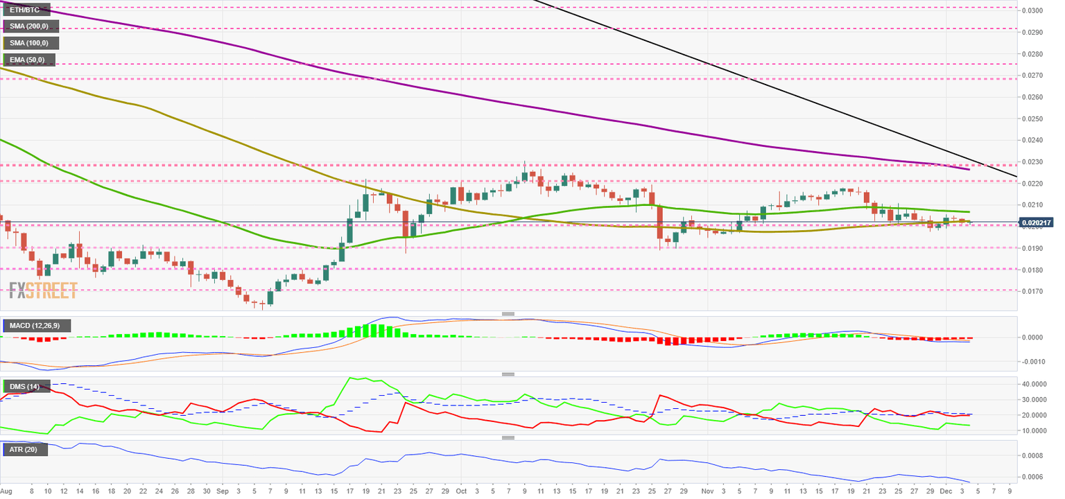 The ETH/BTC pair is currently trading at the 0.0202 price level, within a narrow daily price range that is taking the Average True Range (ATR) to never-before-seen levels.