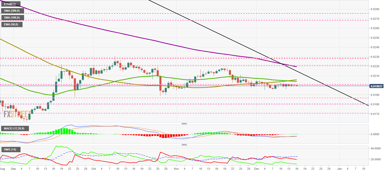 The ETH/BTC pair is currently trading at the price level of 0.01993, dancing a few hundreds above and below the critical level of 0.020.