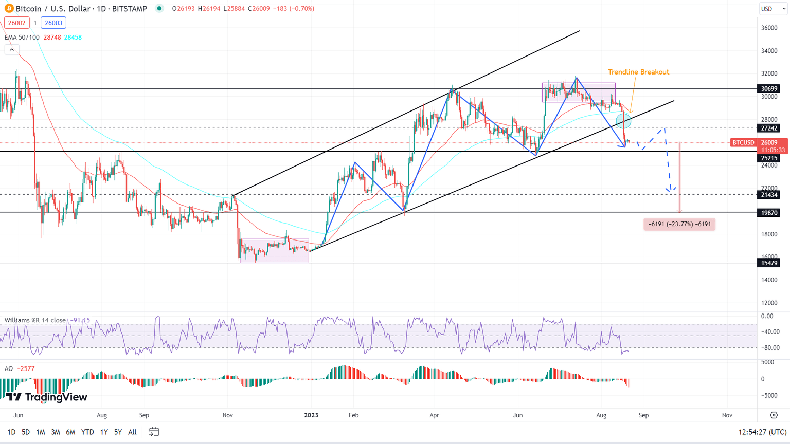 - Bitcoin price downward trend persists post-ascending trendline breach, with a critical support level at $26,012. Possible decline to $20,000 unless conditions change.