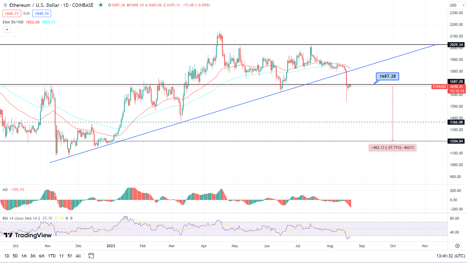Ethereum (ETH) price shows an impending downward trajectory, substantiated by the breach of the ascending trendline. The breach has also led to a dip below the critical support level of $1,687. This development has paved the way for a potential 27% price reduction, potentially reaching the psychological benchmark of $1,200, with intermediate support of $1,366.