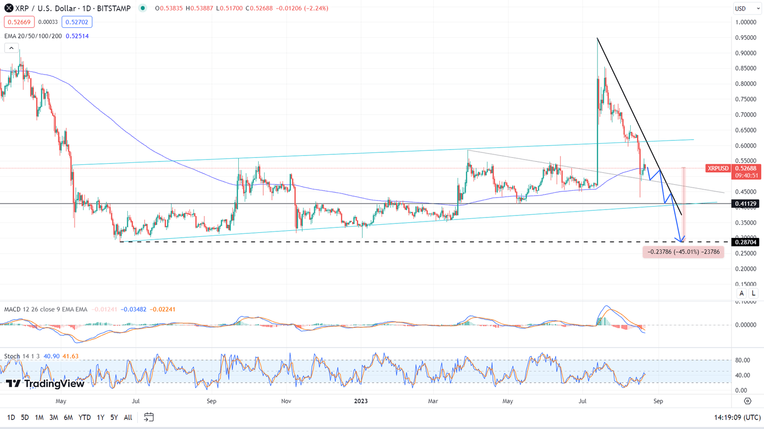 The broader context conveyed by various indicators suggests a likelihood of further price depreciation, potentially reaching the $0.411 level. This level holds significance as the second support threshold, coinciding with the lower boundary of the channel (denoted by the blue color) initiated in June. Should this level prove inadequate in upholding the value of XRP, an extended descent toward the $0.287 level becomes probable, signifying a substantial decline of approximately 45% from the current price.