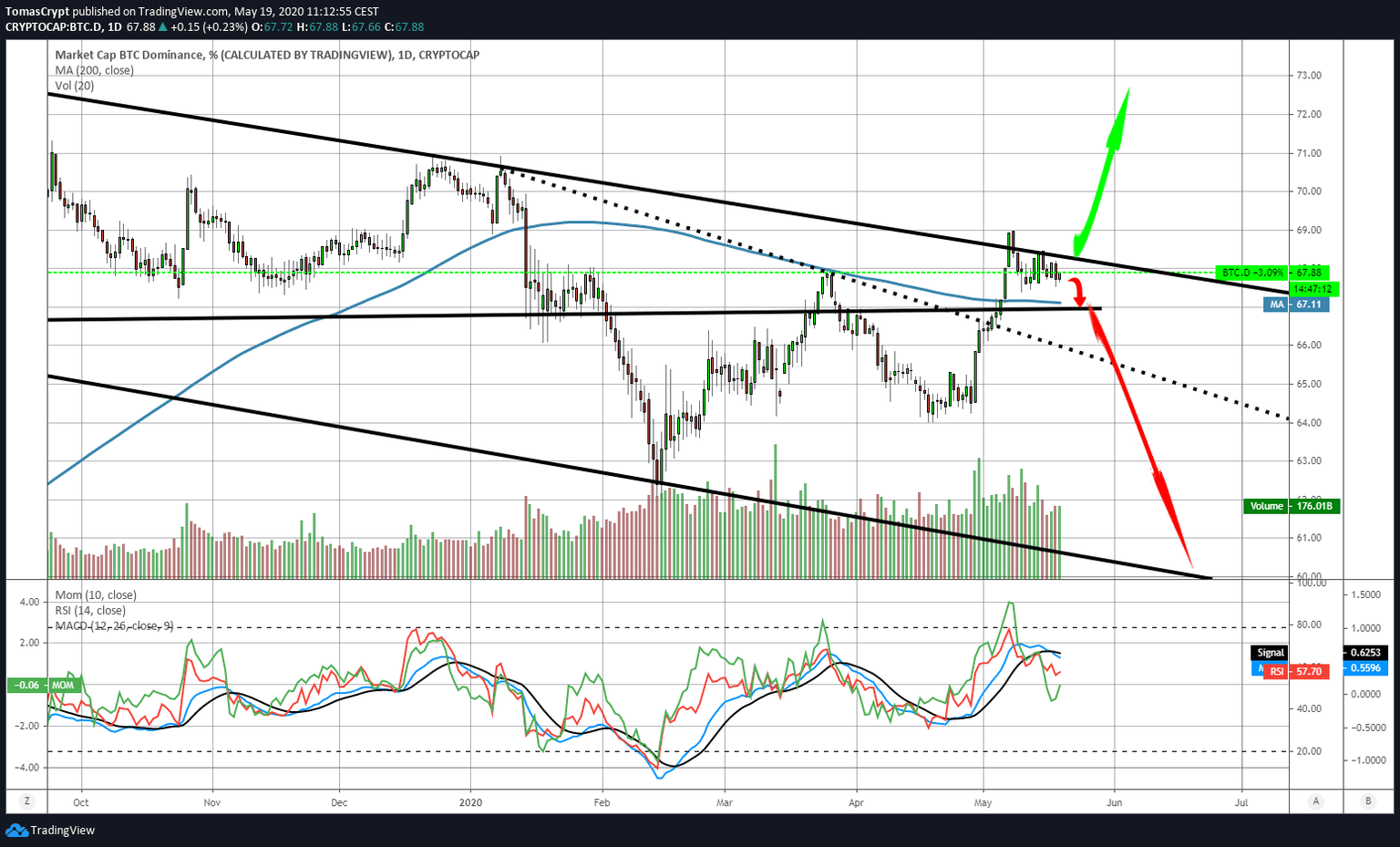 The Bitcoin dominance chart shows that the cryptocurrency leader will continue to lose market share. At the moment, Bitcoin controls 67.67% of the capitalization. Below the current level, there is support at the 67.11% level, but the current bearish channel leaves room for a much more significant drop to the 60% level.