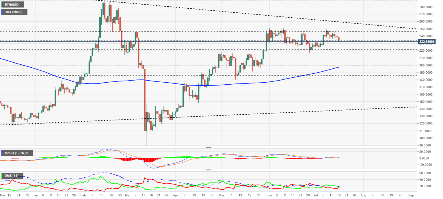 ETH/USD is currently trading at around $232, confirming that it will have a worse drop than that of Bitcoin in this bearish section. The King of cryptos has been in a downward phase for days now, while Ethereum is just beginning to develop its movement.