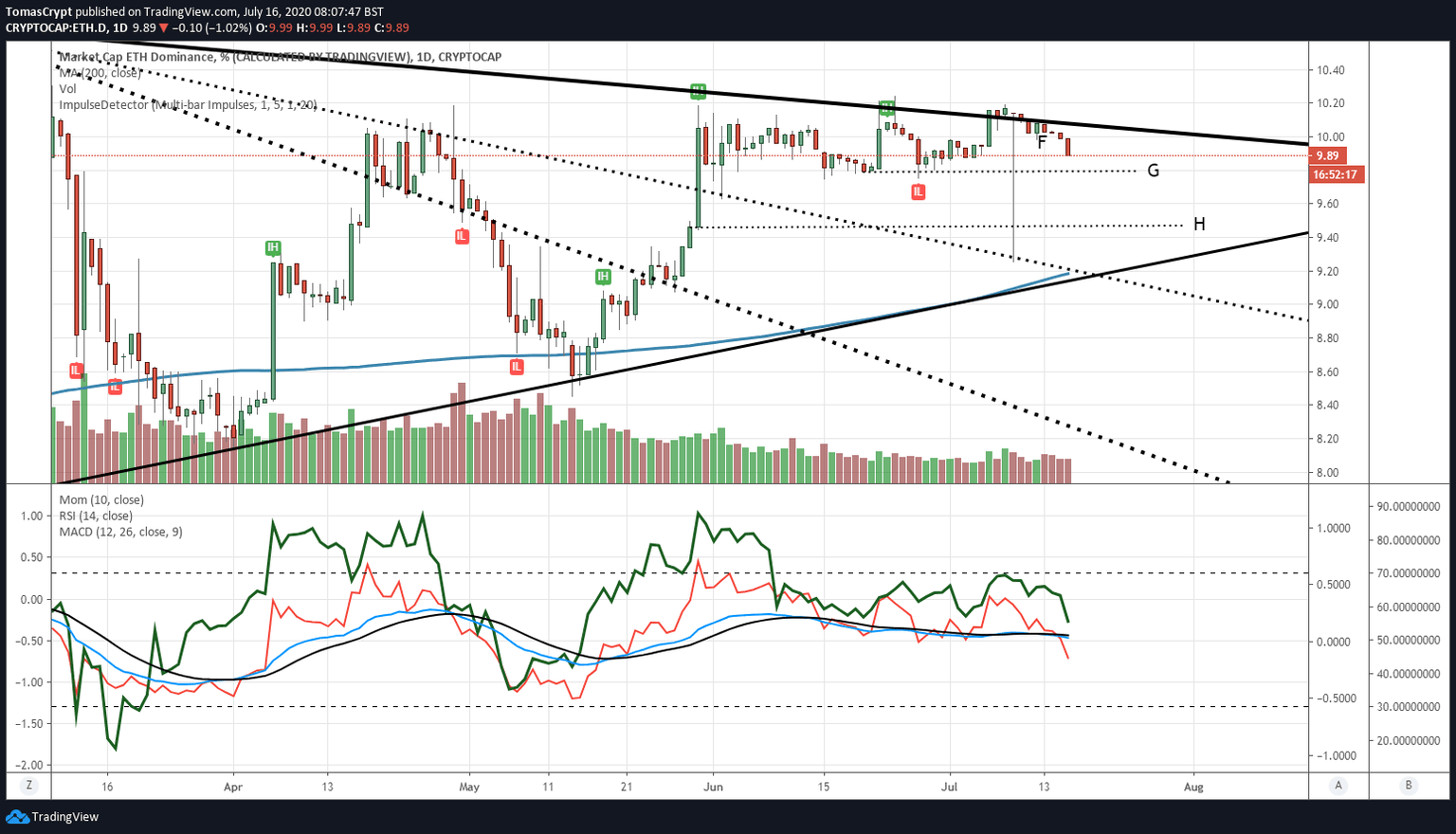 In the case of Ethereum the chart shows how it got back into the bearish scenario (F), and today it is losing the 10% dominance level. Moreover, it heads first towards the 9.79% (G) level, then at 7.49 (H), where it could find second support. The technical indicators show a very aggressive bearish profile, which indicates that the movement may be intense and of some duration.