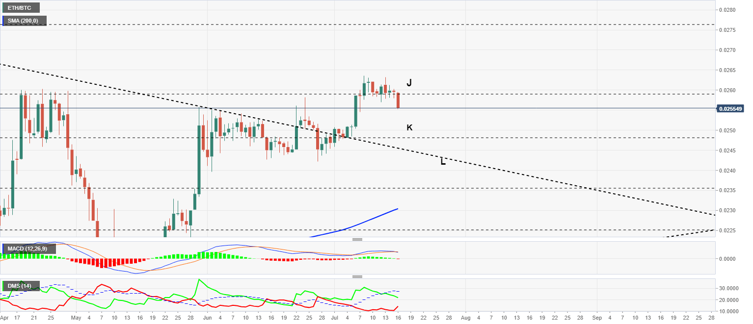 The ETH/BTC chart holds the key to this scenario. The crypto cross is losing its support level at 0.0258 (J) and moves quickly to the first support level at 0.0248 (K). From this support level, the movement could extend to the trend line that marks the upper limit of the triangle figure in the previous scenario (L).