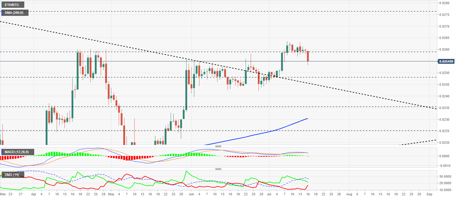 ETH/BTC is currently trading at 0.02549 and, as discussed in the scenario analysis, is moving fast in search of support.