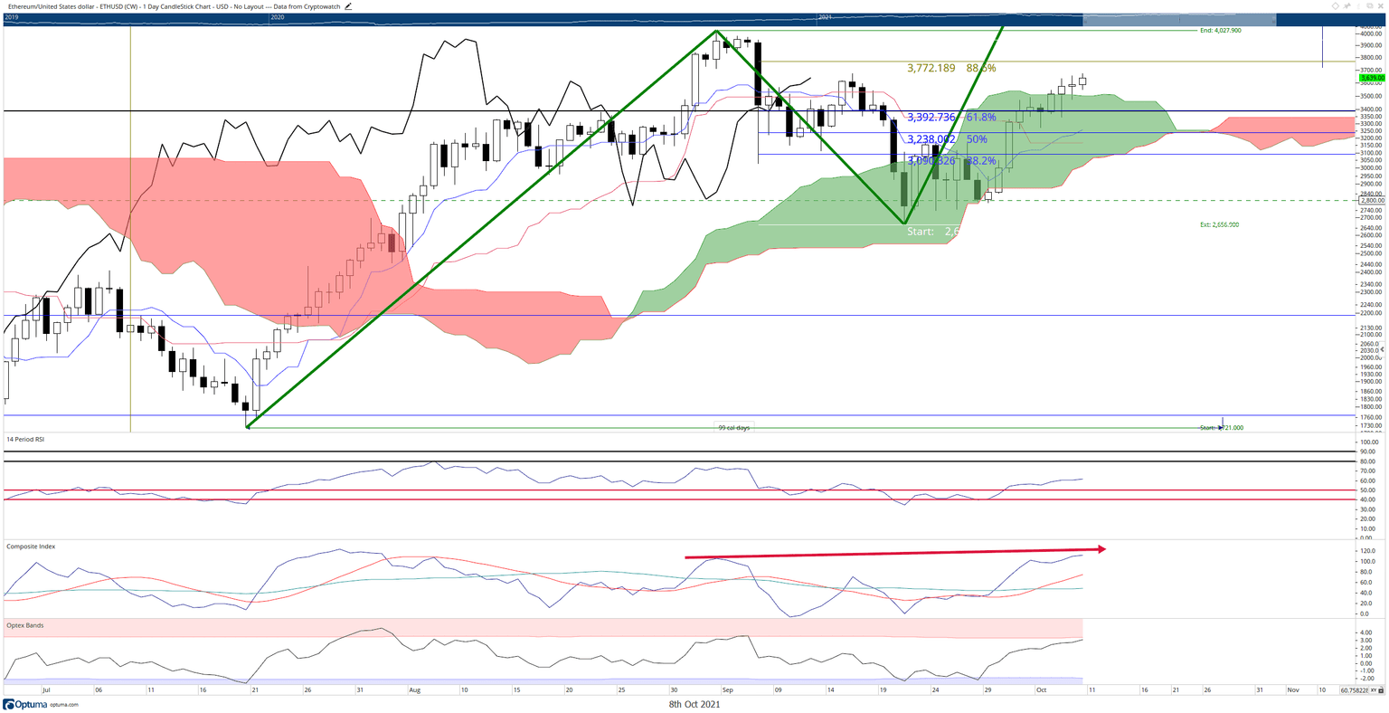 Ethereum price recently fulfilled all conditions necessary to confirm an Ideal Bullish Ichimoku Breakout pattern. Typically, significant momentum enters the market when this pattern completes, and strong buying support crashes in to rally the instrument higher. But while Ethereum has generated some higher moves above the Cloud, the response is not what one would expect to form such a bullish breakout. Warning signs exist in the oscillators that the move could be under threat of termination. The Optex Bands are at an extreme, and there is extended hidden bearish divergence in the Composite Index.