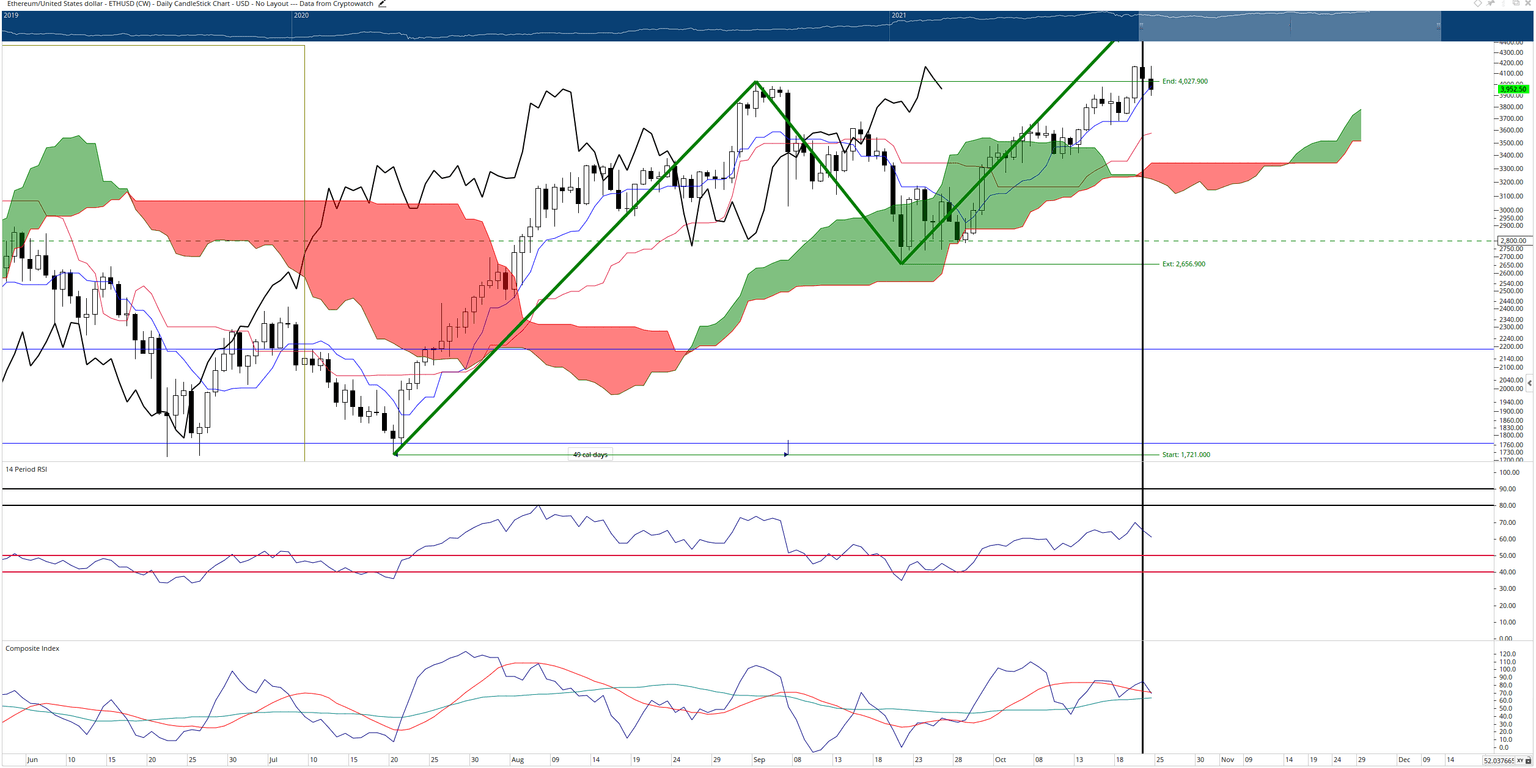 However, watch for signs of selling pressure as the weekend approaches. The black vertical line represents where the nearest Kumo Twist (when Senkou Span A crosses above or below Senkou Span B) is located. Kumo Twists often mark turning points for markets that have been trending strongly at the time of the Twist. Thus, the upcoming weekend would be a perfect opportunity for short-sellers to push Ethereum price lower to test Kijun-Sen at $3,575 or Senkou Span B at $3,350.