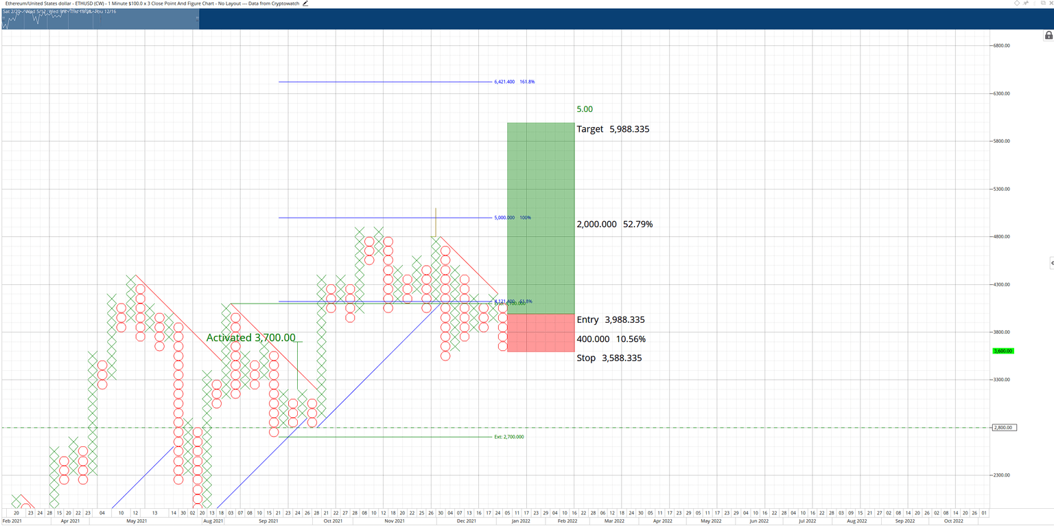 The hypothetical long entry for Ethereum price is a buy stop order at $4,000, a stop loss at $3,500, and a profit target at $6,000. This trade represents a 5:1 risk/reward ratio and 52% implied gain from the entry. A trailing stop of two to three boxes would help protect any potential profit after the entry is triggered.