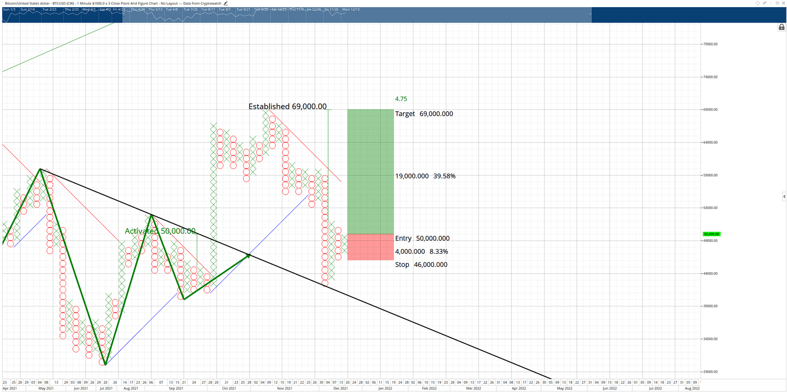 The hypothetical long entry is a buy stop order at $50,000, a stop loss at $46,000, and a profit target at $69,000. A two to three-box trailing stop would help protect any implied profits after the entry. This trade is invalidated if Bitcoin price drops to $40,000 before the entry would trigger.