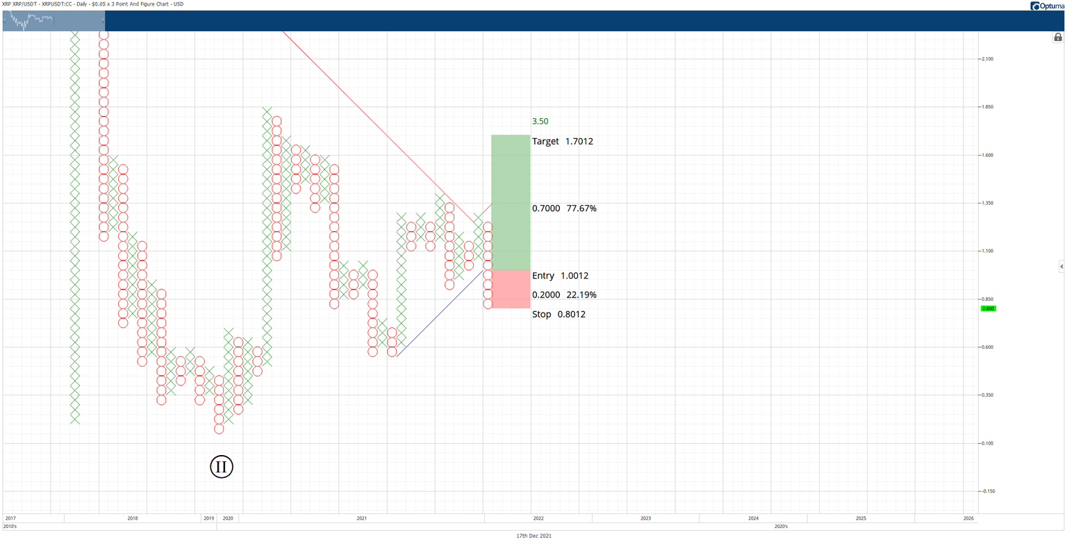The $0.05/3-box reversal Point and Figure chart shows the same pattern entry reviewed in past weeks. A hypothetical long entry would occur on the three-box reversal with a buy stop at $1.00, a stop loss at $0.80, and a profit target at $1.70. This trade idea has no invalidation point because the entry would trail further downside movement.