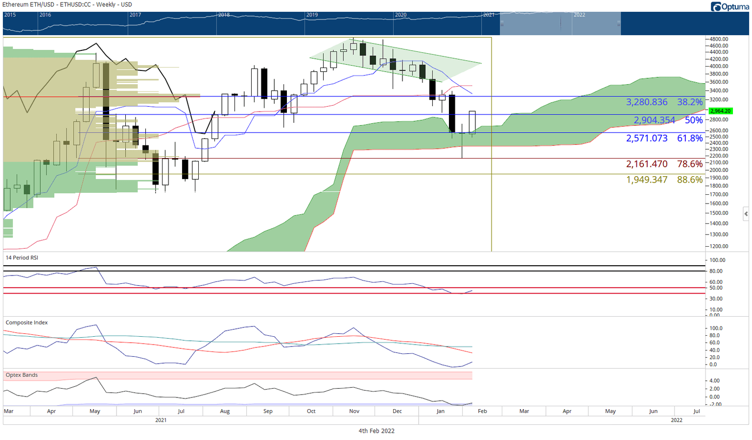 Support against the 61.8% Fibonacci retracement and top of the Ichimoku Cloud (Senkou Span A) likely confirms a floor of support. The next target for bulls is the 50% Fibonacci retracement at $2,900 – but more likely, it is the critical and psychological price level of $3,000.