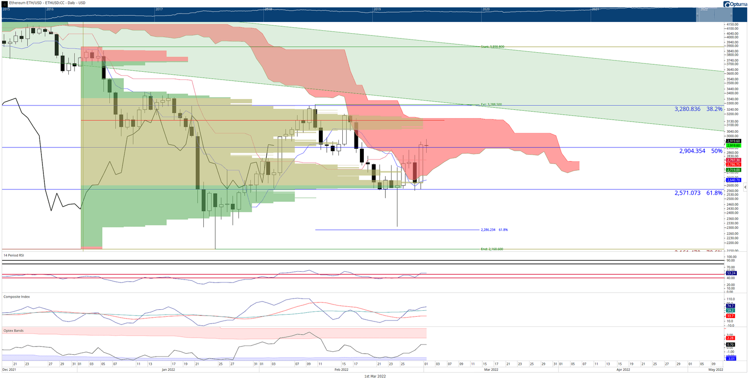 At a minimum, Ethereum price needs to close above the $2,700 level – or just above the bottom of the daily Ichimoku Cloud (Senkou Span A). Instead, ETH closed Senkou Span A and then squeezed out a close above the 50% Fibonacci retracement at $2,900.