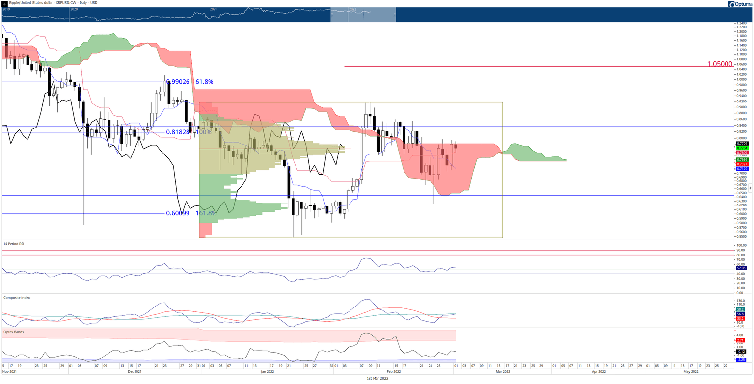 However, a positive development of XRP’s drive higher yesterday was breaking out and closing above the Tenkan-Sen, Kijun-Sen, and 2022 Volume Point Of Control. The only level preventing an Ideal Bullish Ichimoku Breakout is Senkou Span B. Bulls need to close XRP price at or above $0.7850 to confirm a new uptrend. Upon confirmation, the next target XRP price will test is the $1.00 value area.