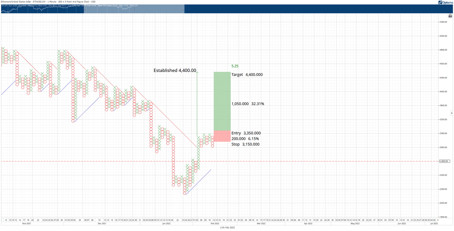There is a hypothetical buy entry setup on Ethereum's $50/3-box reversal Point and Figure chart. The setup is a buy stop order at $3,350, a stop loss at $3,150, and a profit target at $4,400. The trade represents a 5.25:1 reward/risk with an implied profit target of 32% post entry.