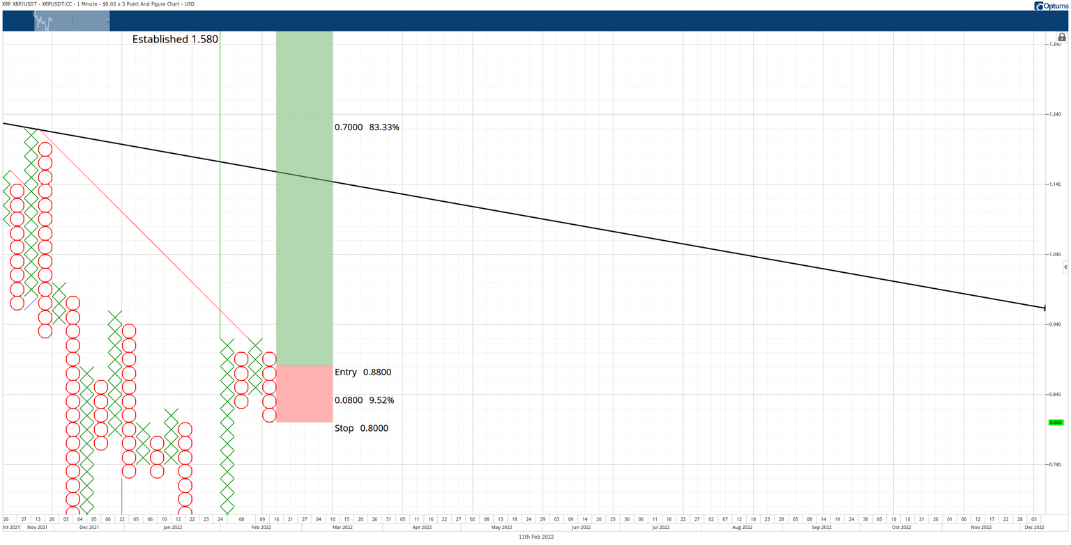 The theoretical long opportunity is a buy stop order at the three-box reversal, presently at $0.88. The stop loss is a four-box stop, and the profit target is near the most recent dominant trend line at $1.14. If XRP price moves lower, the entry and stop-loss follow in tandem.