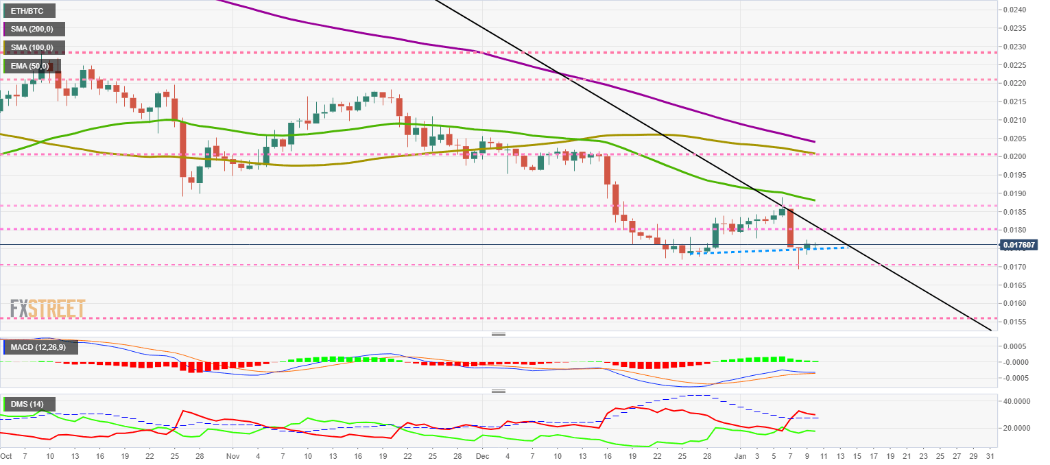 ETH/BTC is currently trading at 0.0176 and plays with the support of the triangle shape with a ceiling on the long term downward trend line.