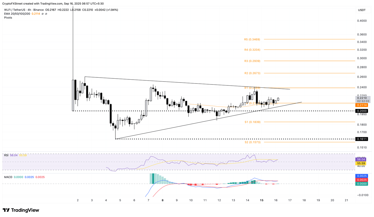 Looking down, if WLFI token drops under the support trendline moving close to the 50-period EMA at $0.2114, it could test the $0.2000 psychological level, followed by the S1 pivot level at $0.1839.