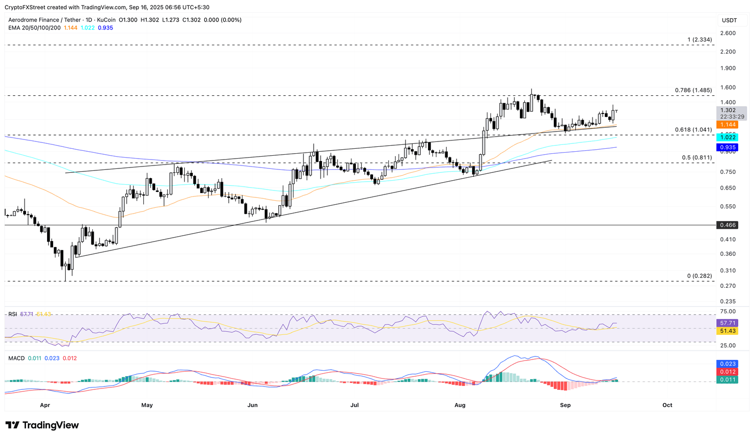 Aerodrome Finance trades above $1.300 at the time of writing on Tuesday, recovering from the intraday low of $1.273. The Decentralized Exchange (DEX) token has upheld 8% gains from Monday, resulting in a bounce back from the 50-day Exponential Moving Average (EMA) at $1.144 and the center pivot level at $1.147.