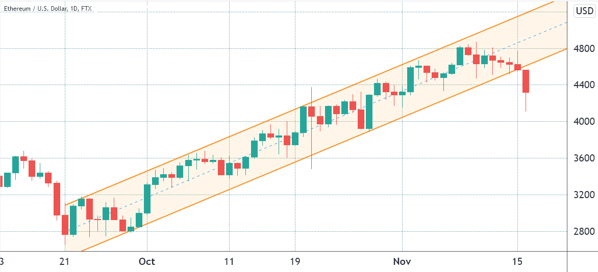Ether (ETH) traders might have a few reasons to panic after today's 13% drop down to $4,100. The swift pullback appears to have broken a 55-day ascending channel that had a target at $5,500.