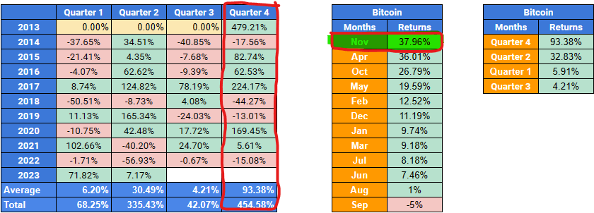The adjacent tabulation corroborates the story, showing that Q2, with April standing out, has always been a good month for Bitcoin price, but not as good as Q4, specifically November.