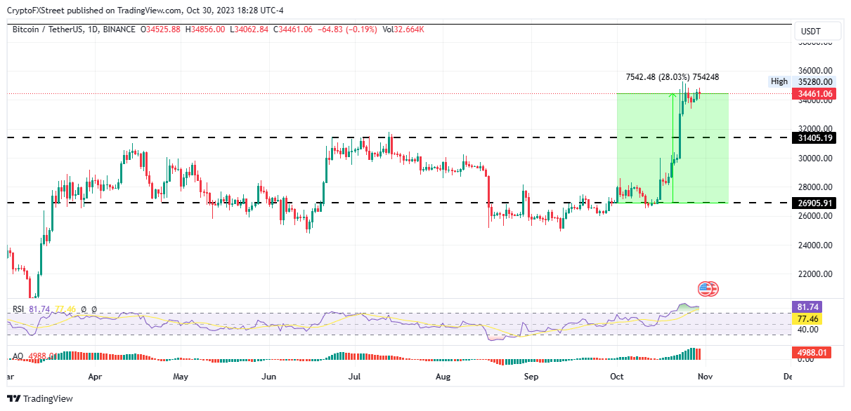 - Bitcoin price has pumped 30%, moving from $26,900 on October 1 to the current price of $34,465 on October 31.