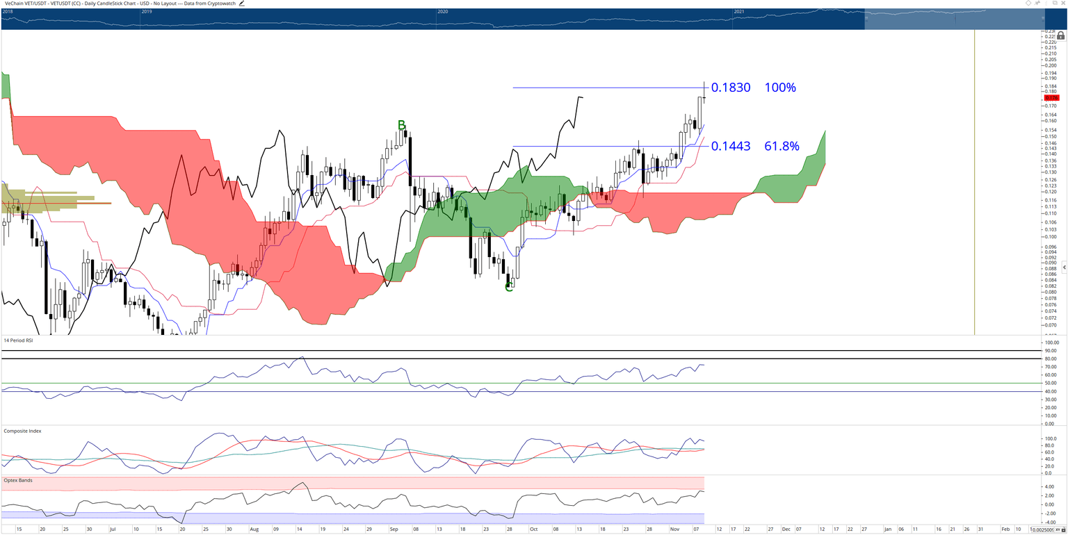 VeChain price has a large gap between the current daily candlestick and the Tenak-Sen. That gap appears as VeChain hits resistance against the 100% Fibonacci expansion at $0.1830. Here, a pullback is likely, with a mean reversion setup targeting $0.15 to $0.16 value areas – the same as the current Kijun-Sen and Tenkan-Sen.
