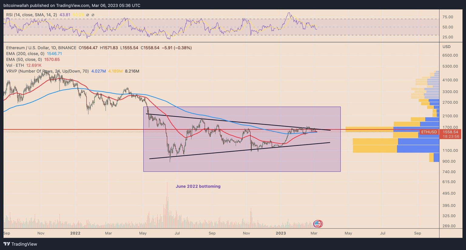 Ether’s 78% price recovery since July 2022 is at risk of exhaustion due to an unconvincing volume profile.