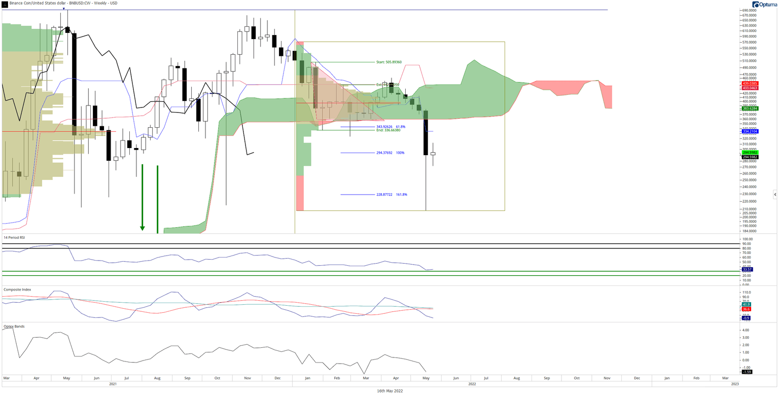 For bulls, the interpretation of BNB's performance may be a leading indicator that Binance Coin price action may lead the broader market. For example, on the weekly Ichimoku chart, BNB just confirmed an Idea Bearish Ichimoku Breakout – but given last week's candlestick and the position of the weekly oscillators, that move may be a fakeout.