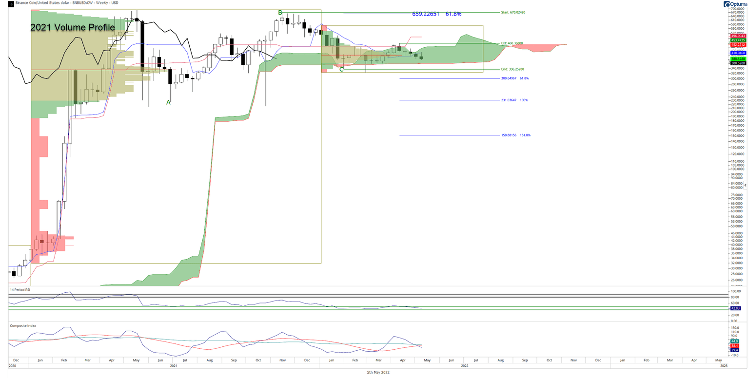 Binance Coin price has one primary support structure left on its weekly chart: the $340 to $360 value area where the bottom of the Ichimoku Cloud (Senkou Span B) and the 2021 Volume Point of Control exist.