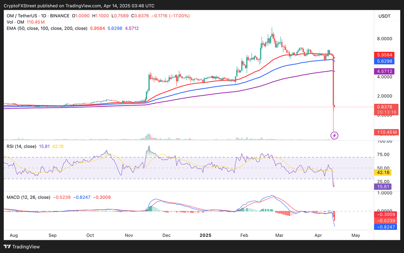 - OM price trades at $0.83 in the wake of a resounding plunge from $6.33 on Sunday.