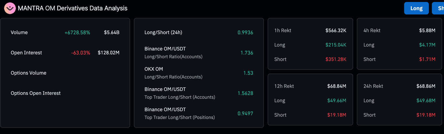 Mantra, the security-first real-world asset (RWA) layer 1 blockchain built for institutions and developers, is in the crosshairs after its native OM token plummeted 90% on Sunday. The crash triggered $68.86 million in 24-hour liquidations, with long positions being hit the hardest at $49.68 million, while short positions lost $19.18 million, per Coinglass data.