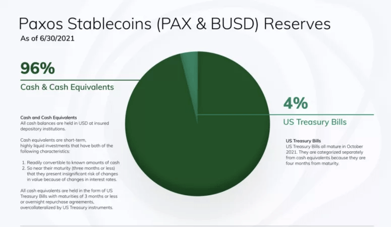 Another stablecoin issuer, Paxos, also released for the first time a breakdown of reserves for its stablecoins, Paxos standard and the Binance-labeled BUSD. Some 96% of the reserves were held in cash and cash equivalents, while 4% were invested in U.S. Treasury bills as of June 30.