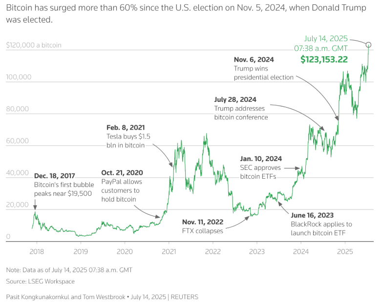 Bitcoin's recent surge past the $123,000 mark highlights just how quickly sentiment can shift in favor of digital assets—especially when regulatory clarity and macroeconomic forces align. This latest rally, part of a broader upward trend that has seen the cryptocurrency set multiple all-time highs in recent weeks, is being driven by a confluence of political, economic, and structural factors. Legislative progress in Washington, a weakening U.S. dollar, rising inflation concerns, and shifting investor perceptions around alternative stores of value are all contributing to Bitcoin’s renewed appeal.