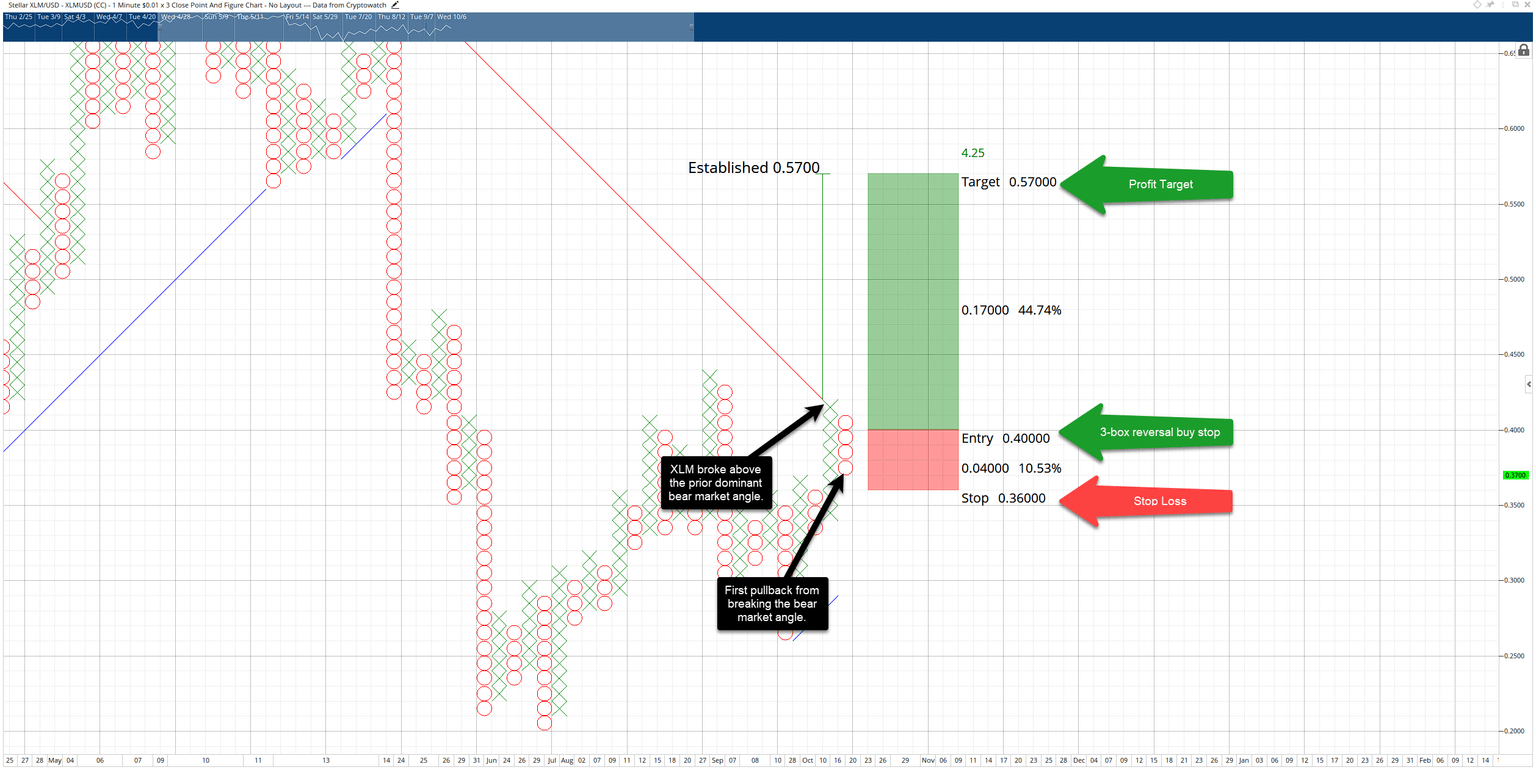 XLM price has a very bullish set up on its $0.01/3-box Point and Figure chart. When XLM hit the $0.42 price level, that was the breach of the dominant bear trend angle on the Point and Figure chart. The result was a shift from bear market conditions to bull market conditions. Additionally, the pattern created a Pole Pattern.