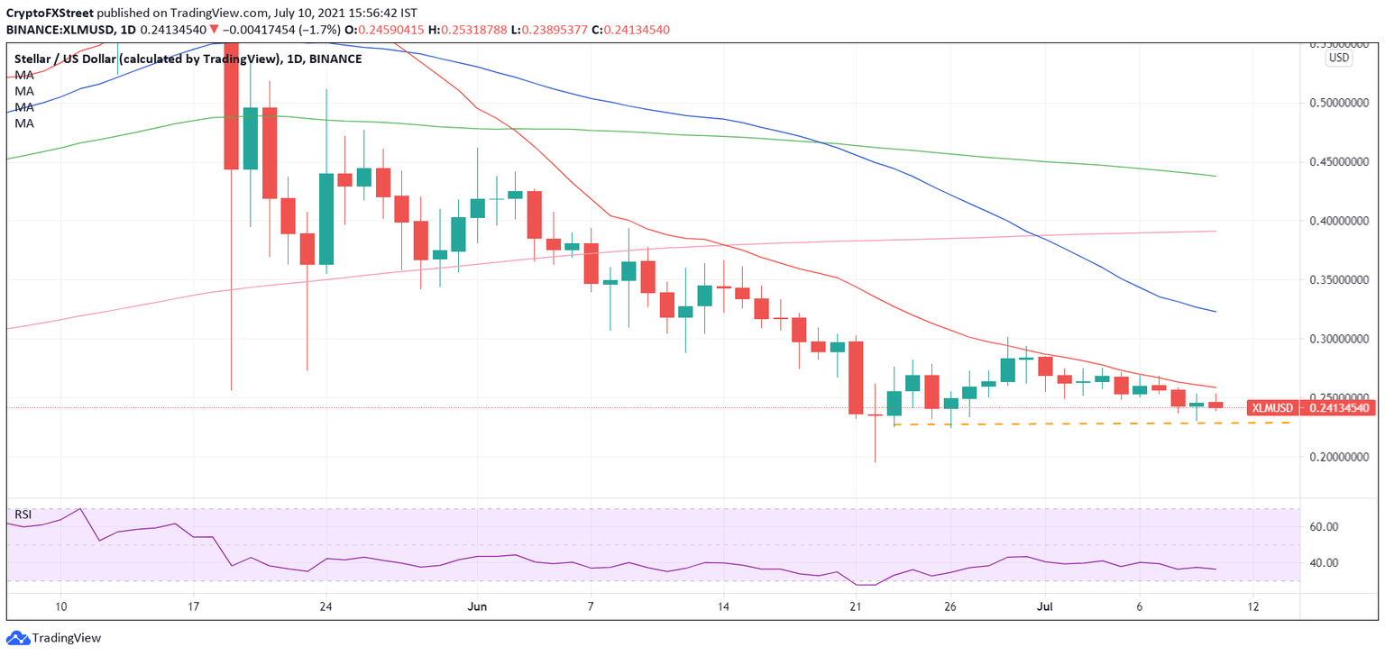XLM price has been on a steady decline since June 29 peak at $0.3012, where a death cross was confirmed on the daily sticks. At the press time, the altcoin is trading just above the $0.2400 barrier, having reversed Friday’s recovery gains.
