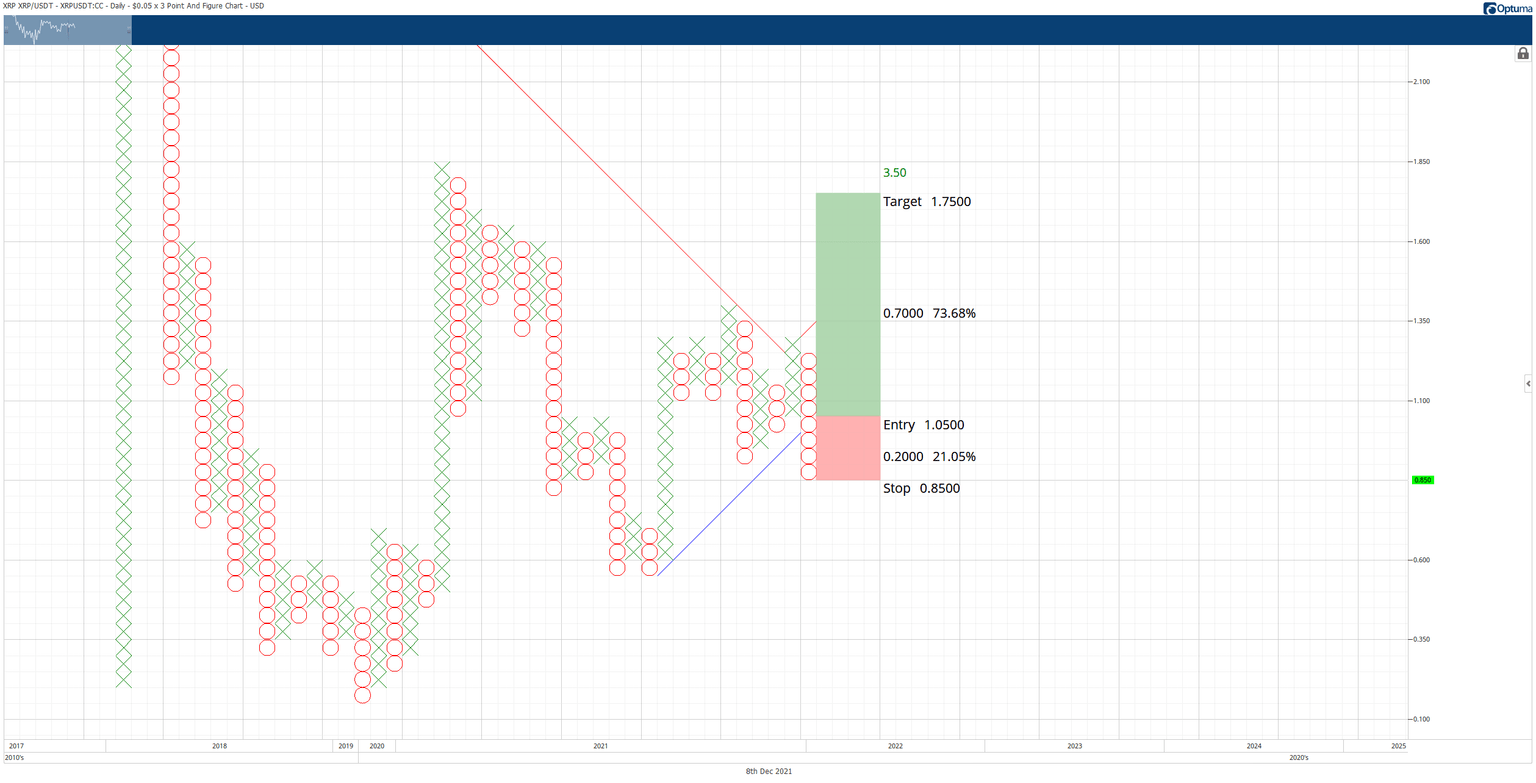 There is a hypothetical long trade opportunity on the $0.05/3-box reversal Point and Figure XRP price chart. The entry is a buy stop at $1.05, a stop loss at $0.85 and profit target at $1.75. The entry is based on a Point and Figure pattern known as a Bearish Shakeout. This pattern is valid only when a trend reversal is anticipated and positioned to do so. A two-box trailing stop would help protect any implied profits.