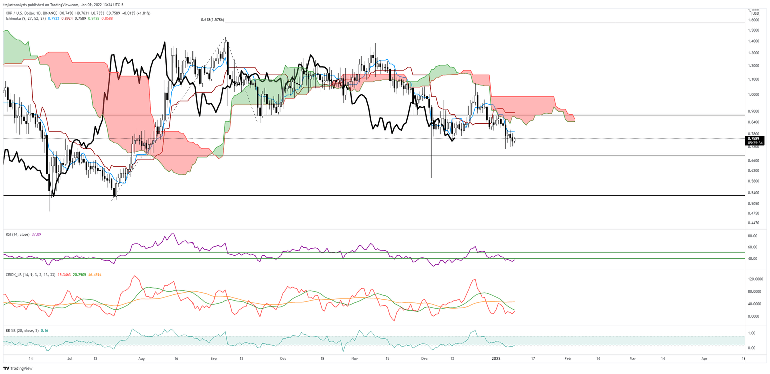 Buyers should expect an easy move to rest resistance at $0.90 where the Kijun-Sen, 38.2% Fibonacci retracement, and bottom of the Cloud (Senkou Span A) currently exist. Above that, the next major hurdle is the critical and vital $1.00 level. Ultimately, bulls will need to close and remain above the $1.00 level to pursue any new major uptrend.
