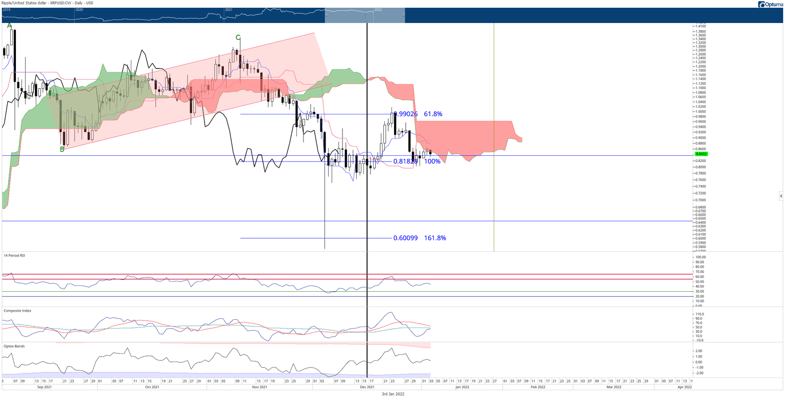 XRP price has been oscillating above and below the 38.2 Fibonacci retracement at $0.84 and the 100% Fibonacci expansion at $0.82. It had a close inside the Ichimoku Cloud on yesterday’s close – the first time since November 20.