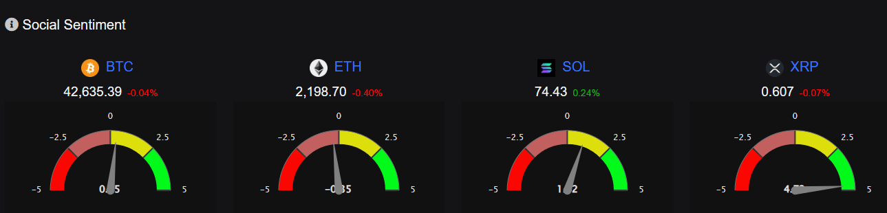 Meanwhile, Ripple (XRP) market remains broadly optimistic, according to social sentiment data, flashing green at the five index as Bitcoin (BTC), Ethereum (ETH), and Solana (SOL) remain borderline impartial under the 2.5 index.
