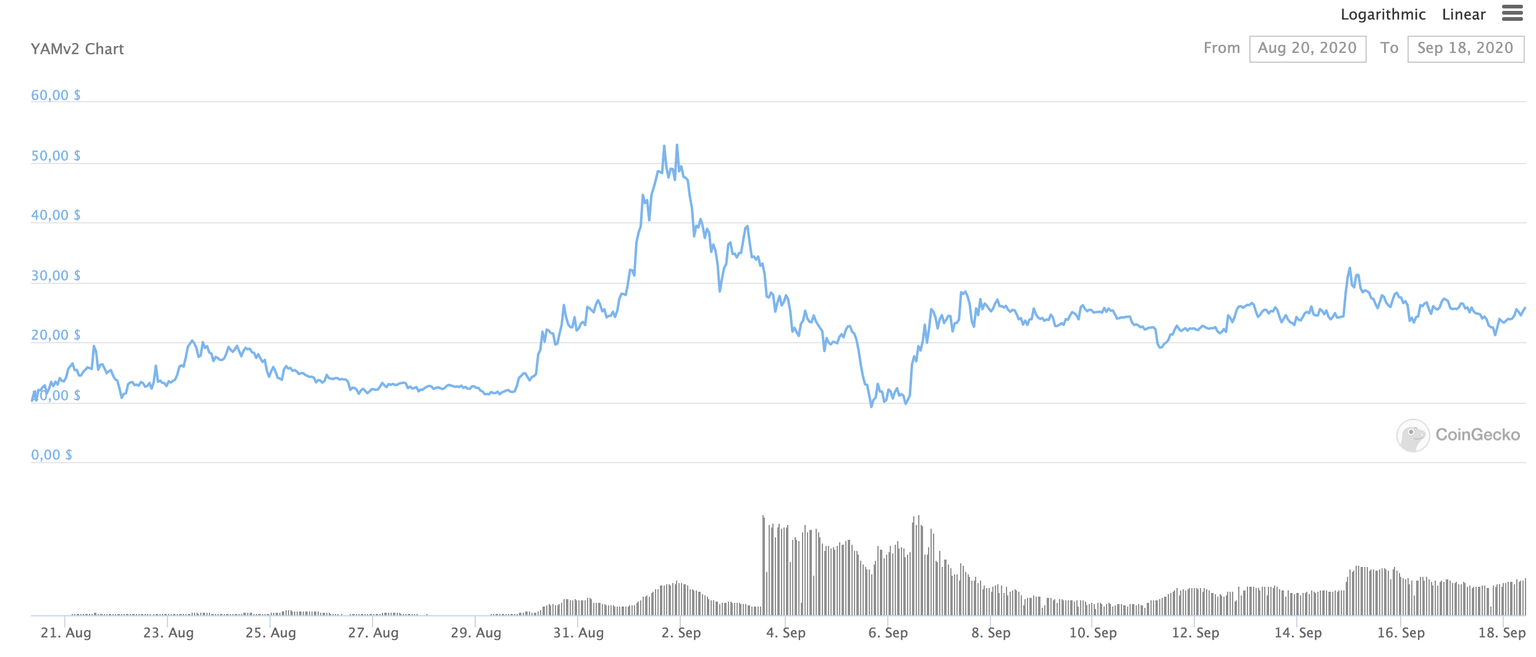 Following the migration, YAMv2 emerged. The token managed to climb $32 but failed to repeat the previous success and returned to $25.7 by the time of writing. YAMv2 token takes 111th place in the global cryptocurrency market rating, with the current market capitalization of $96 million and an average daily trading volume of nearly $60 million. The token is most actively traded on the cryptocurrency exchange BiKi.