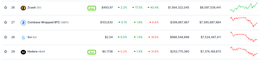 Zcash soared more than 17% so far this week and is nearing the $500 mark at the time of writing on Thursday. CoinGecko data shows that ZEC’s market capitalization has surged above $8 billion, putting it in the 26th spot in the overall crypto market and surpassing popular altcoins such as SUI and HBAR.