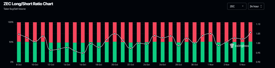 Additionally, the long-to-short ratio for the privacy-focused cryptocurrency stood at 1.05 on Thursday, nearing its monthly high. This ratio, above one, reflects bullish sentiment in the markets, as more traders are betting on the ZEC to rally.