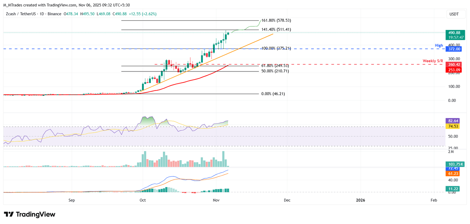 Zcash (ZEC) price continues its upward trend, trading above $490 at the time of writing on Thursday, having rallied over 17% so far this week. The privacy-focused cryptocurrency’s market capitalization has climbed above $8 billion, surpassing popular altcoins such as Sui (SUI) and Hedera (HBAR). With bullish momentum strengthening, technical indicators suggest ZEC could target the next major resistance level at around $578.