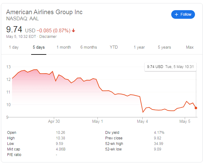 - American Airlines' share prices are declining while broader stock markets are on the rise.