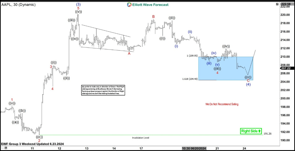 Here’s the 1-hour Elliott wave chart from the 6.23.2024 weekend update. In which, the short-term cycle from the 5.23.2024 low ended in wave (3) at $220.20 high. Down from there, the stock made a pullback in wave (4) to correct that cycle. The internals of that pullback unfolded as Elliott wave zigzag structure where wave A ended at $211.30 low. Wave B bounce ended at $218.95 high and wave C managed to reach the blue box area at $209.95- $204.40. From there, buyers were expected to appear looking for the next leg higher or for a 3 wave bounce minimum.