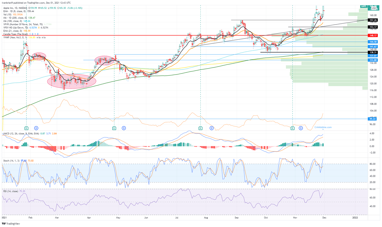 To cancel it out Apple stock needs to power on to $170. On the flip side, an inverted head-and-shoulders pattern is also showing. The head is the dip on November 26 and the double tops are the two shoulders. An inverted head and shoulders is bullish. Which one is going to win? If only it were that easy. Knowing the potential is half the battle.