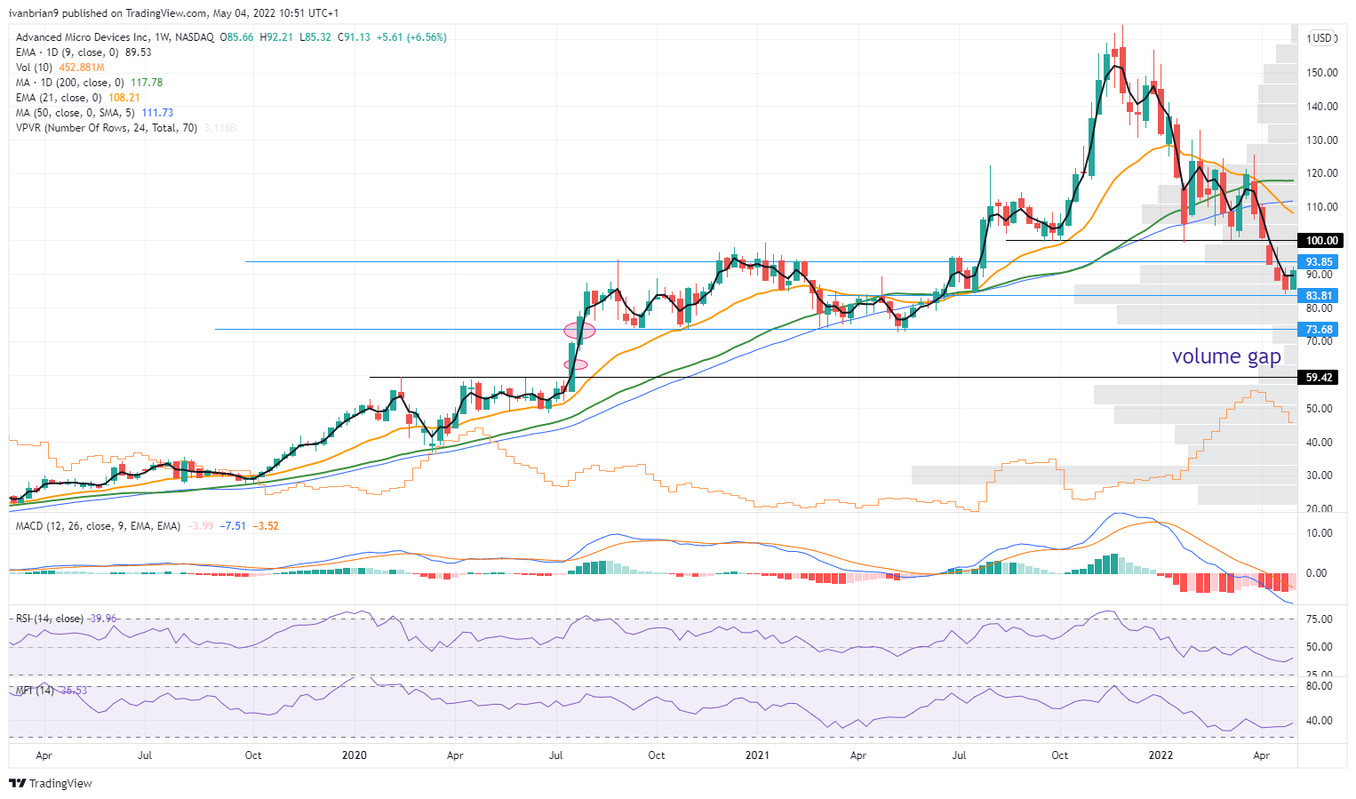 $100 is the key psychological level here and that would clearly end the bearish trend. That would also fill the gap from April 11. The weekly chart shows us how key support at $73.68 is. A huge volume gap below could see a sudden acceleration to $59.42. $100 here too is clearly a pivot, below more losses are likely for AMD stock.