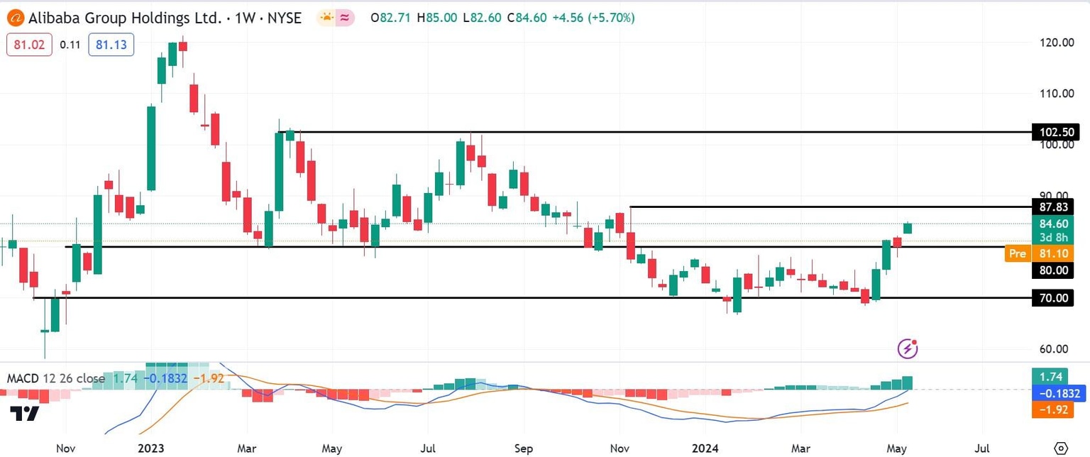 To move back into a bullish technical pattern, BABA stock must close above last November's range high at $87.83 on the weekly chart. Over the past month, Alibaba's weekly chart shows the Moving Average Convergence Divergence (MACD) rotating back into a bullish crossover, so some hope exists that recent excitement won't dwindle completely.
